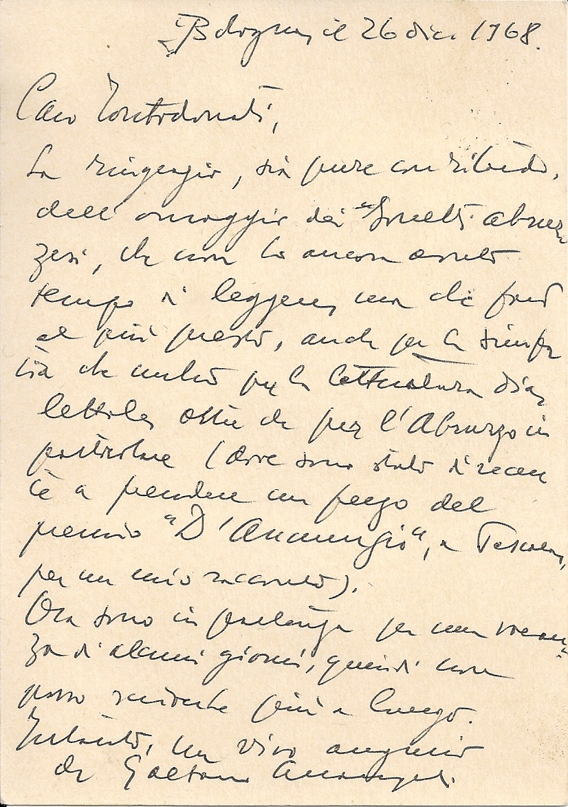 Ecco uno scritto di Gaetano Arcangeli a Tontodonati nel '68 dopo aver ricevuto in omaggio una copia del volume di poesie "Storie Paesane" prima opera di Tontodonati: